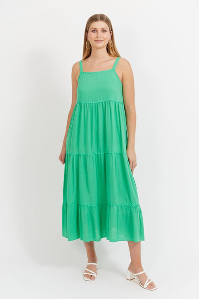 Your no-fuss, go-everywhere summer hero. The Haiti Tank Maxi Dress is tiered, flowing, and versatile - from beach strolls to balmy nights out. Featuring a straight neckline, adjustable straps with gold-tone hardware, and an elasticated back panel for comfort. Ric-rac trim along the neckline and skirt tiers adds playful charm, while internal side pockets keep things practical.