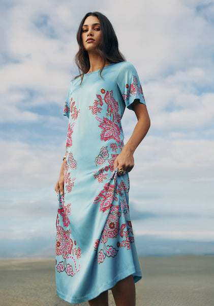 A luxe t-shirt style dress, in a silky printed stretch viscose. With bust darts, back neck opening and side splits to elevate.
