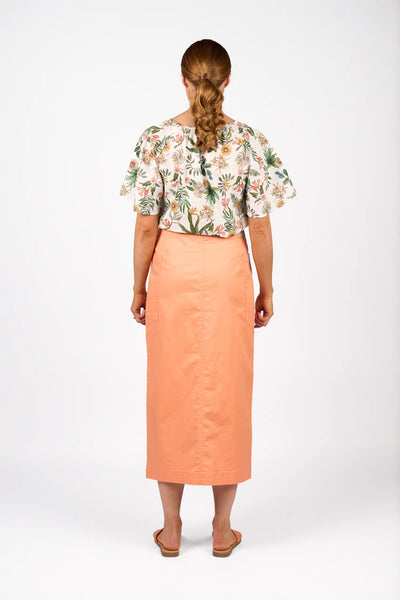 The Bay Skirt is a lightweight denim midi that’s perfect for warmer days. With a flattering centre front seam and a split for ease of movement, it combines effortless style with practical side patch pockets for everyday wear.