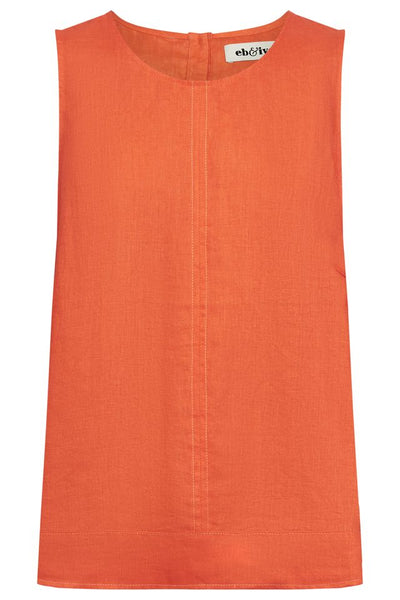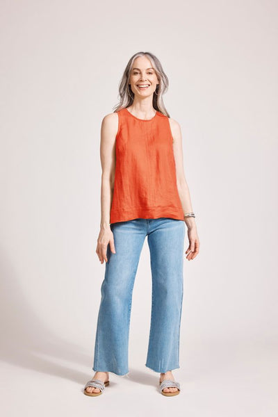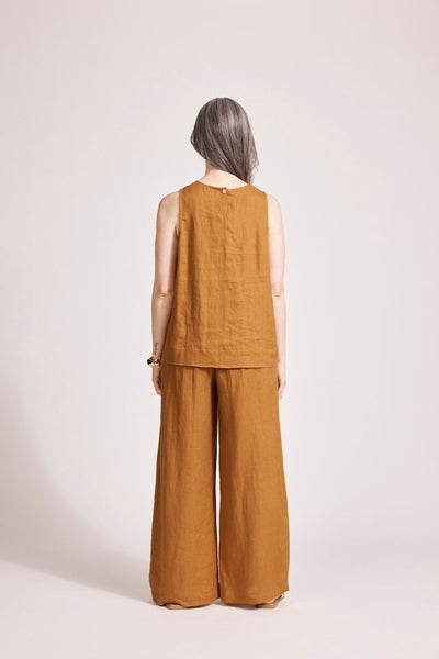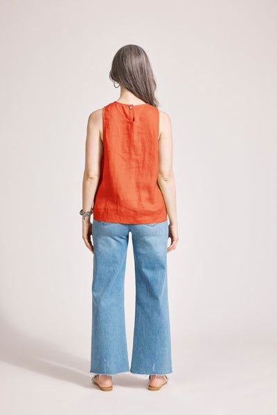 A relaxed linen tank with refined detailing. Crafted from 100% linen for breathable comfort. Features exposed shoulders, contrast decorative topstitching, button closure at the back neck, wide cuffed hem, and soft A-line silhouette.