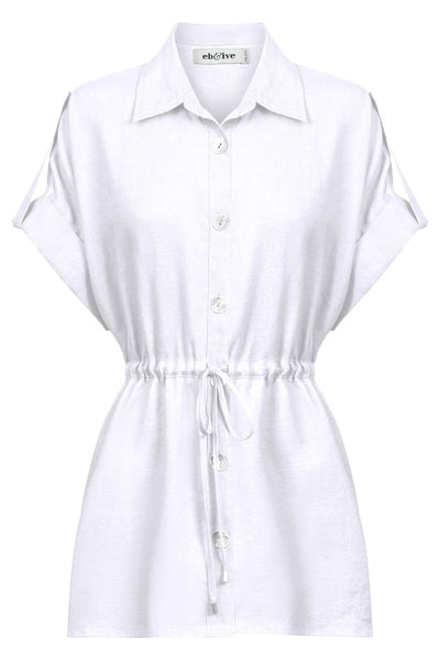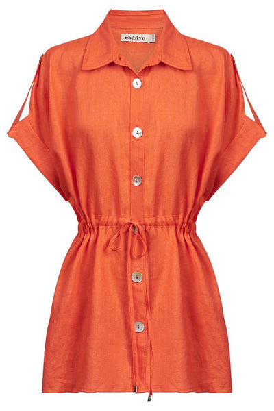 A modern update on a wardrobe classic. Crafted from 100% linen for airy comfort. Features a collared neckline, button-through front, drawstring waist, and side splits to flatter the silhouette. Finished with larger mother-of-pearl buttons and lapel detail at the shoulder.