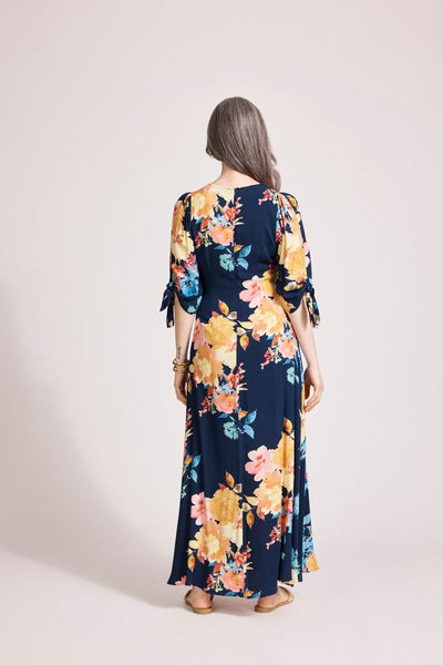 A flowing printed maxi with thoughtful shaping. Features a V neckline, functional tie at mid-length sleeve, and curved seam at waist to enhance silhouette. Crafted from soft viscose and finished in an A-line cut for fluid movement.