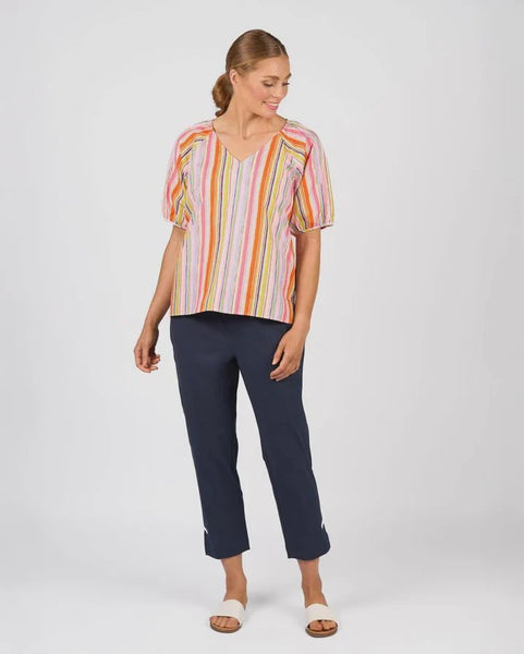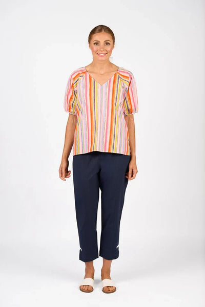 The Focus Top in Bonbon is a breezy summer staple, made from soft 100% cotton in vibrant stripes. With puffed raglan sleeves and a dipped back hem, it brings an easy sense of fun to warm weather dressing.