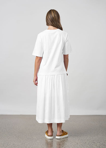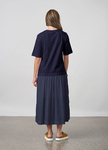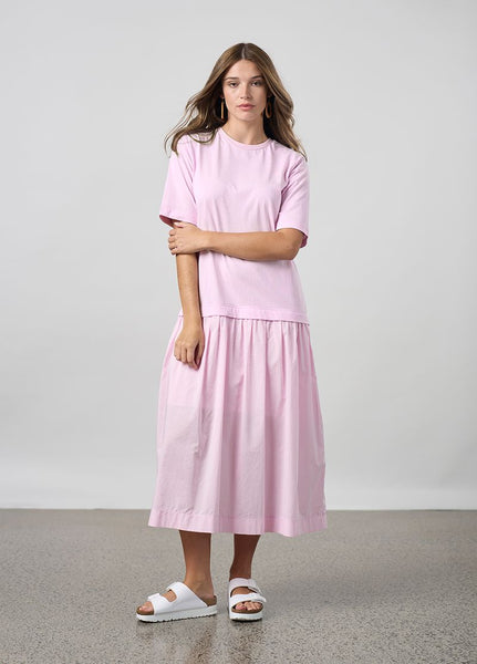 T-shirt styled dress with a round reckline and a dropped waist, made with a soft jersey top, contrasted with a soft cotton skirt.