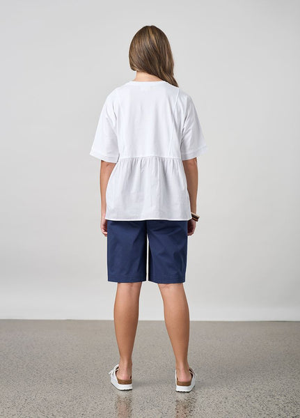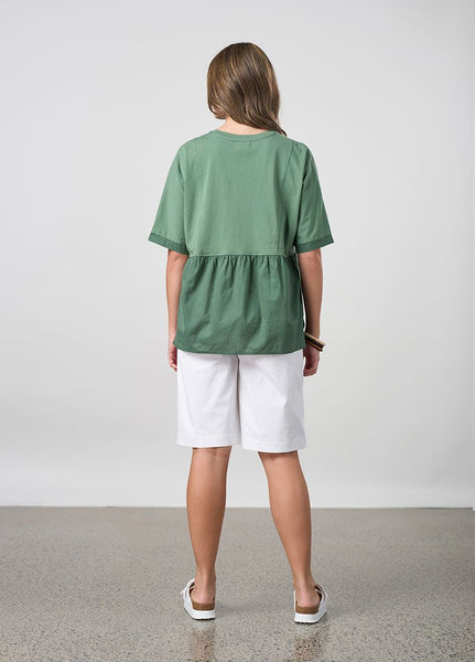 Soft cotton tee with a round neckline and grown on sleeves, featuring panelling seams and contrast detailing.