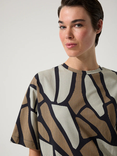 The Bedrock Tee gives the everyday t-shirt silhouette a bold graphic edge. Crafted from 100% cotton, it’s breathable and comfortable while offering that slightly structured drape Marco Polo is known for. The exclusive geometric print - rendered in tonal shades of brown, grey, and black—adds striking contrast without overpowering, making it easy to style with denim, linen, or tailored separates. Finished with a classic round neckline, short sleeves, and a relaxed fit, this is a printed tee that feels elevated yet effortless, perfect for days when you want a touch more personality in your basics.
