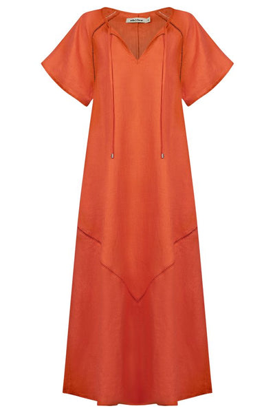 A timeless maxi designed for summer occasions. Crafted from 100% linen for breathable comfort. Features ladder lace trim on front panels and shoulders, ties at the neckline, and a softly tapered waist that flows to a slight A-line silhouette.
