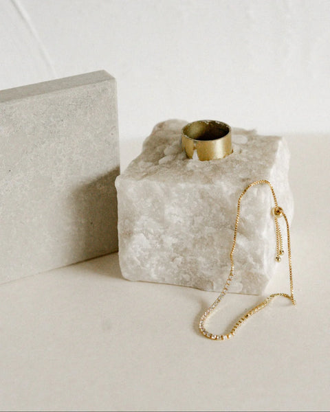 Classic sparkle, reimagined. The Tennis Bracelet in gold features a full row of faceted diamantes set in a sleek gold-plated finish for timeless shine. Elegant and eye-catching, it’s your go-to for adding polish to any outfit – from everyday luxe to evening glam.