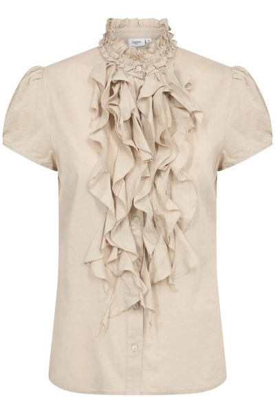 Elevate your wardrobe with this chic and eco-friendly 100% cotton sheer top. Featuring delicate ruffles across the front, it adds a playful and feminine touch to any outfit. Crafted from sustainable recycled polyester, this lightweight and breathable piece is perfect for layering or wearing alone for a bold, stylish statement. The sheer fabric offers a flattering, modern silhouette, making it ideal for both casual and dressier occasions. Embrace fashion with a conscience in this fashionable, environmentally conscious top.