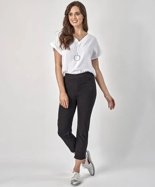 7/8 length slim leg pant made from a soft cotton-viscose stretch fabric for the perfect fit. Designed with an elastic waistband, front side angle pockets, and back faux welt pockets for a neat, everyday look.